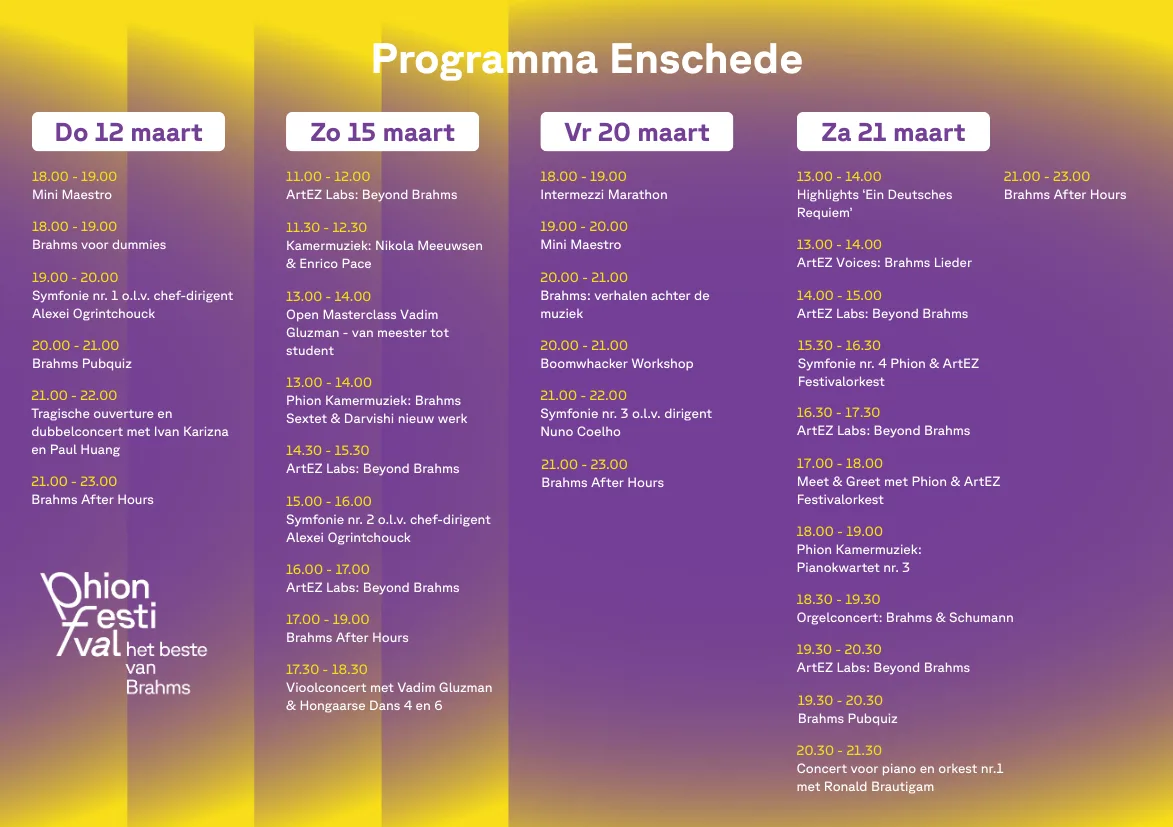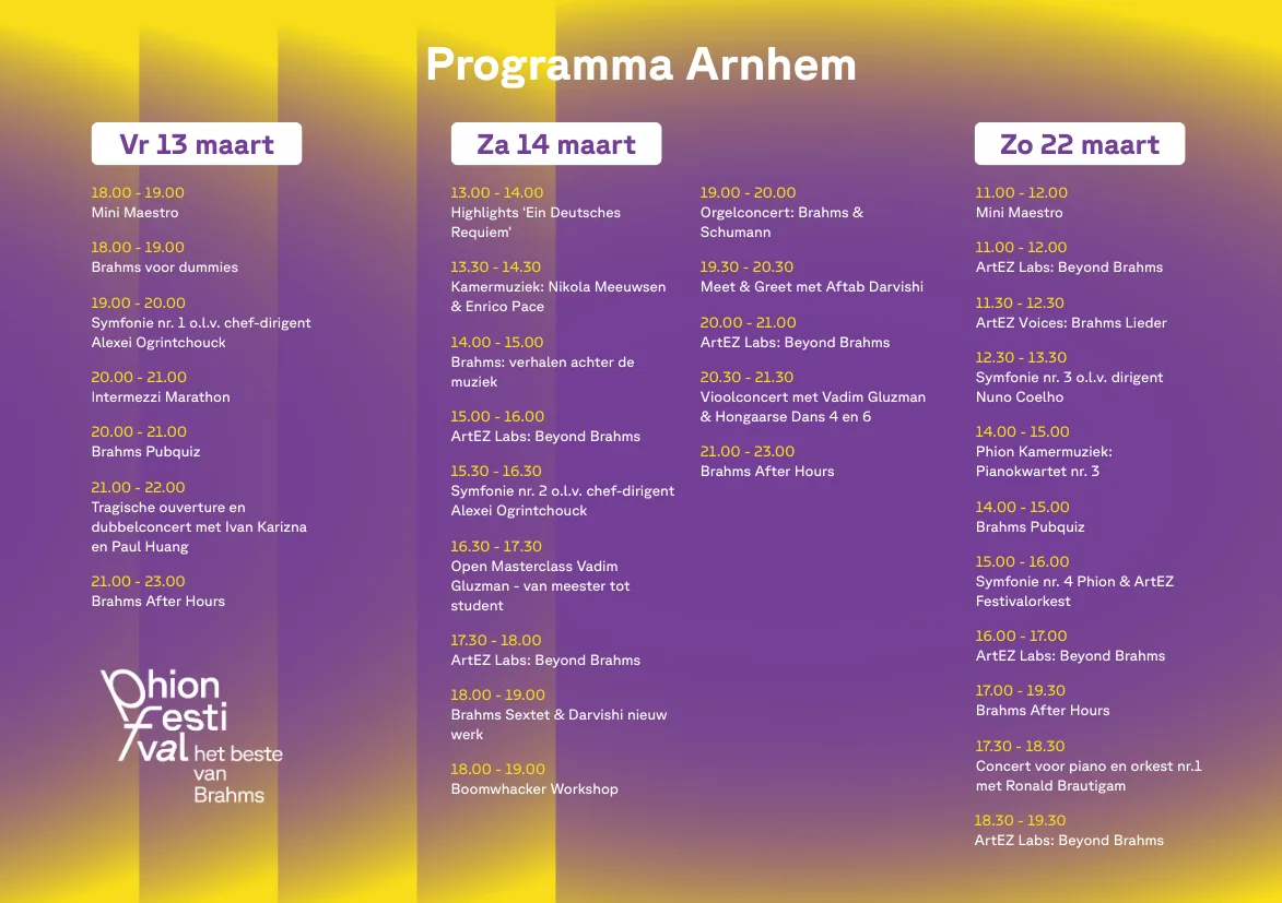 Een bijzondere toevoeging: in maart klinkt ieder kwartier muziek van Brahms vanuit het carillon van de Eusebiuskerk. Op zaterdag 14 maart om 10.00 uur speelt stadsbeiaardier Bob van der Linde een volledig Brahms-programma.