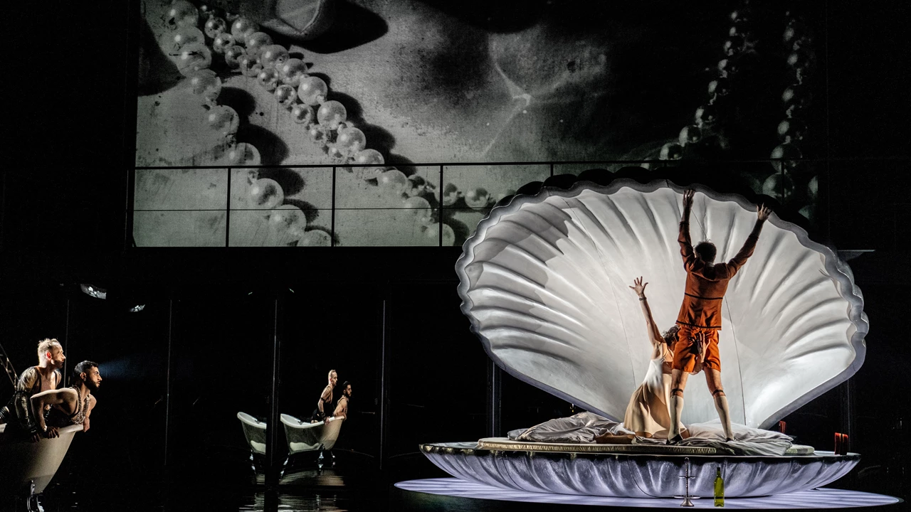 ‘In het mooie spiegelende decor, met een grote venusschelp als blikvanger, kreeg iedereen er (terecht) van langs. Zonder de ingebakken humor uit het oog te verliezen werd de opera steeds gelaagder en donkerder. In de bak leverden de vijftien Phion-musici een heuse topprestatie. Otto Tausk leidde hen met bewonderenswaardig overzicht door de hels moeilijke partituur.’