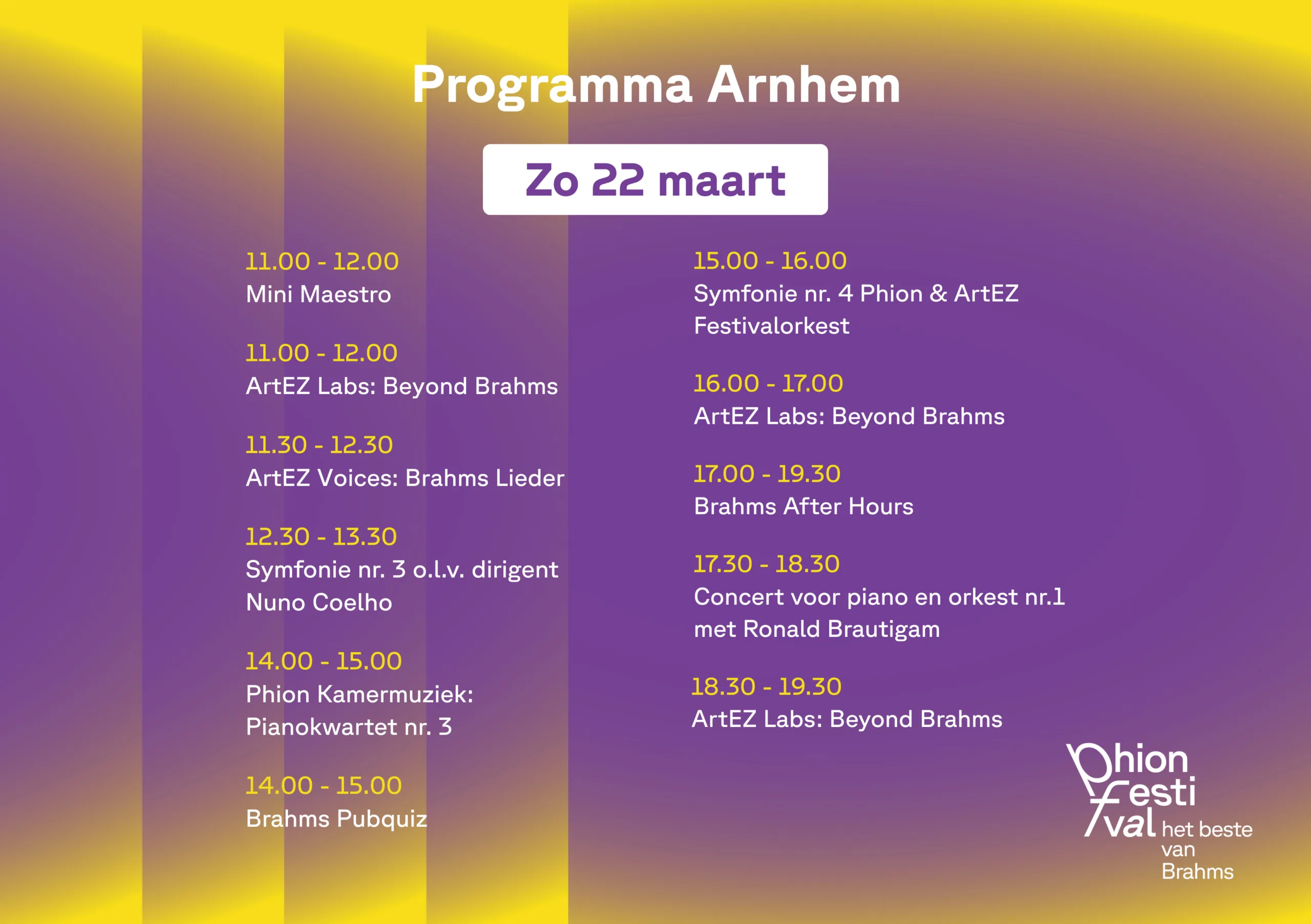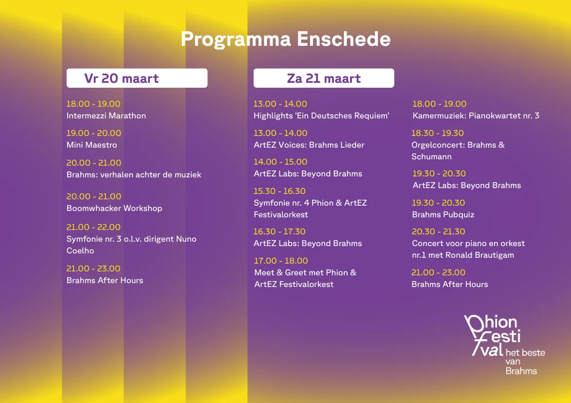 Van 12 t/m 22 maart 2026 beleef je in Muziekcentrum Enschede en Musis Arnhem het Phion Festival: twee weekenden volledig gewijd aan Johannes Brahms. In beide steden klinkt hetzelfde programma, met alle vier de symfonieën, uitgevoerd door Orkest Phion onder leiding van Alexei Ogrintchouk en Nuno Coelho. De Vierde symfonie wordt gespeeld door het Phion & ArtEZ Festivalorkest.
