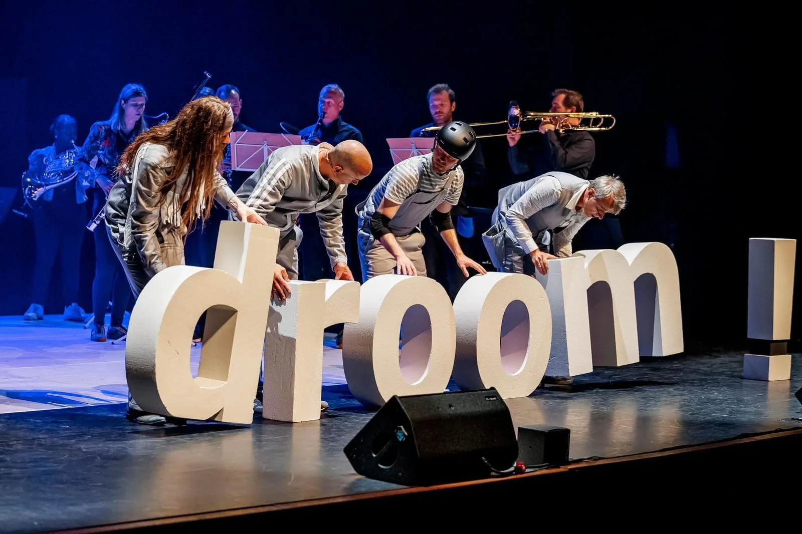 Monique Wijnker, programmamaker van ‘Droom!’, vertelt: ‘De productie wordt gemaakt onder leiding van een artistiek team bestaande uit een regisseur, een choreograaf en een muzikaal coach. Daarnaast ondersteunt Percossa met vier slagwerkers, die eigenlijk ook acteurs zijn, de voorbereiding. ‘Van de musici worden veel andere vaardigheden gevraagd dan gebruikelijk: een groot deel van de muziek uit het hoofd spelen, over het toneel bewegen waarbij balans en houding belangrijk zijn, én dan moeten ze óók nog een duidelijke expressie hebben bij het reageren op gebeurtenissen in de voorstelling.’ Voor musici is dat een hele andere manier van muziek maken. Om hen daarop voor te bereiden is er een trainingsdag geweest. Ook musici die niet in ‘Droom!’ spelen, konden mee doen. Bassiste Rebecca Fransen nam ook deel aan die trainingsdag: