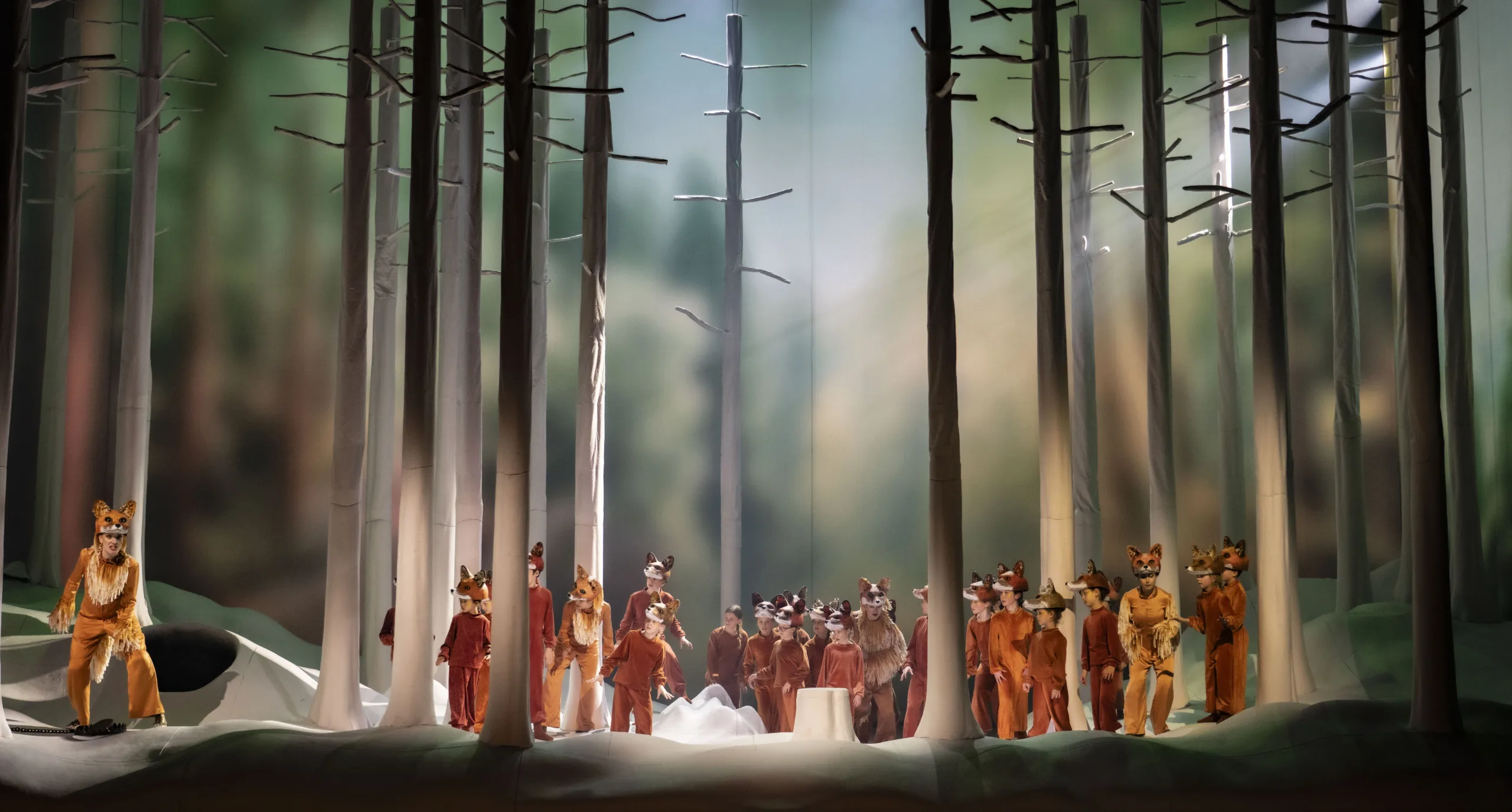 Voor het kijkspel staat de afdeling decor, licht- en kostuumontwerp van de Reisopera garant. En de regie voor al wat er beweegt op het toneel. Die zorgt ervoor dat de zangers van Consensus Vocalis uit Twente ook nog ogen als een gezelschap kakelende kippen in de ren. En later blijkt het kinderkoor van de Reisopera tegelijkertijd een druk en vrolijk nest jonge vosjes te zijn.